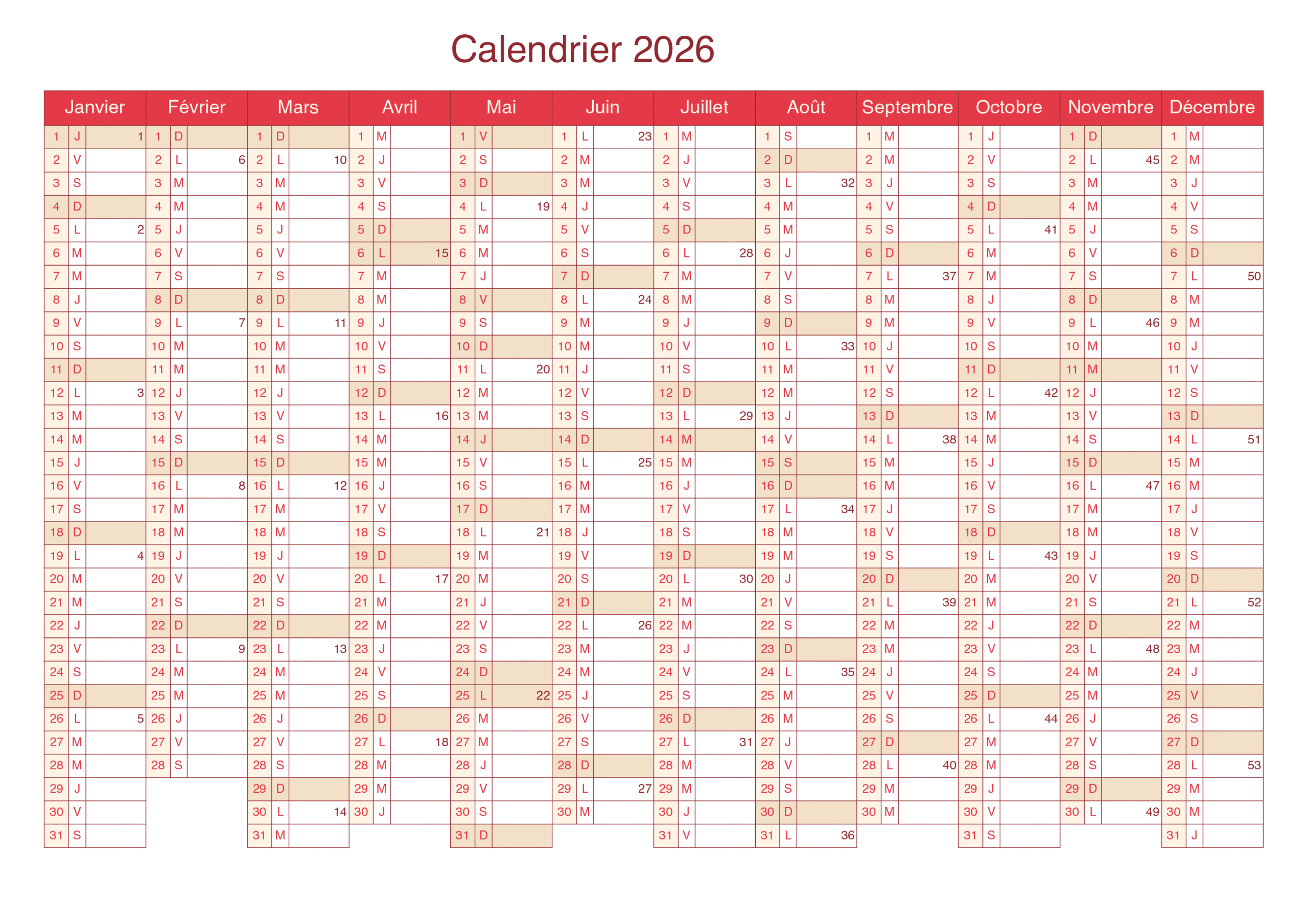 • Calendrier Gratuit 2026 Modèle Semaine Imprimable [PDF, Mot]